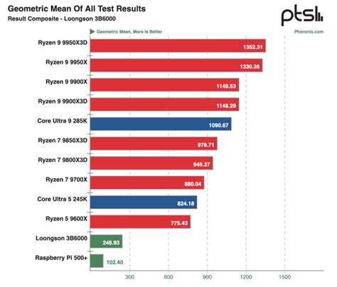 En score global, il délivre environ un tiers des performances d'un Ryzen 5 9600X (Zen 5). Mais il talonne 2,5 fois un RPi 500+. On sort nettement des ordinateurs monocartes. Le 3B6000 se loge directement dans la catégorie des processeurs de bureau capables.